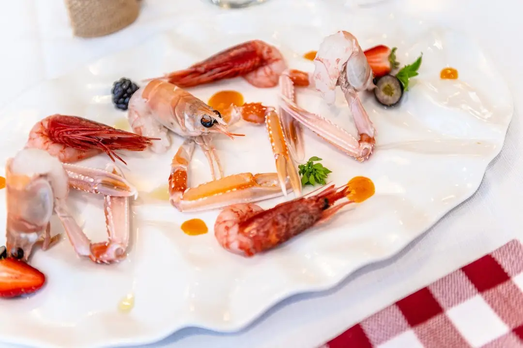 Scampi, rote Garnelen, Heuschreckenkrebse, Tintenfischstreifen, Jakobsmuscheln, Canestrelli, Thunfischtatar und Lachs-Sashimi
