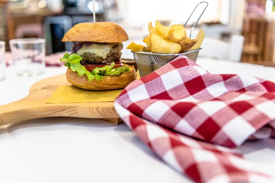 Unser hausgemachter 200-Gramm-Burger mit ausgewähltem Fleisch, Sauerteigbrot, Tomate, Salat, Käse und angebratenen Zwiebeln, serviert mit Dippern und BBQ-Sauce